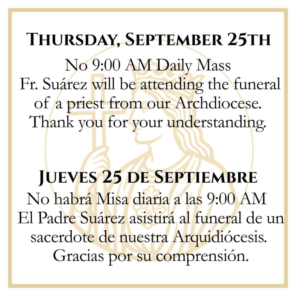 Bulletin September 21, 2025September 19, 202525 de septiembre – No habrá Misa a las 9:00 AMSeptember 23, 2025 September 25th, No 9AM Daily Mass Related postsSeptember 30, 2025October 5th, Coffee & DoughnutsRead more Comments are closed.