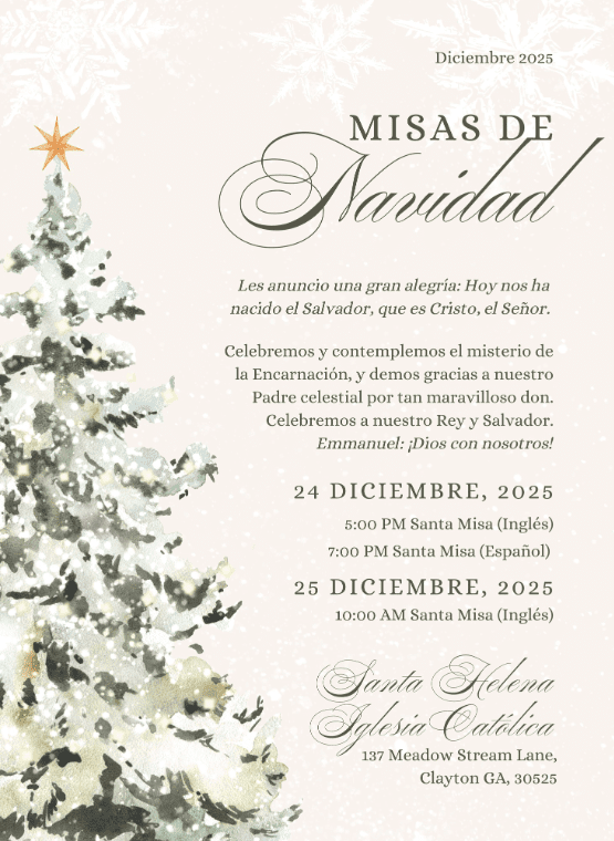 Children’s Christmas Program Dec 24 at 6:30December 20, 2025Christmas MassesDecember 20, 2025 Misas de Navidad Related postsEl AdvientoRead more Comments are closed.